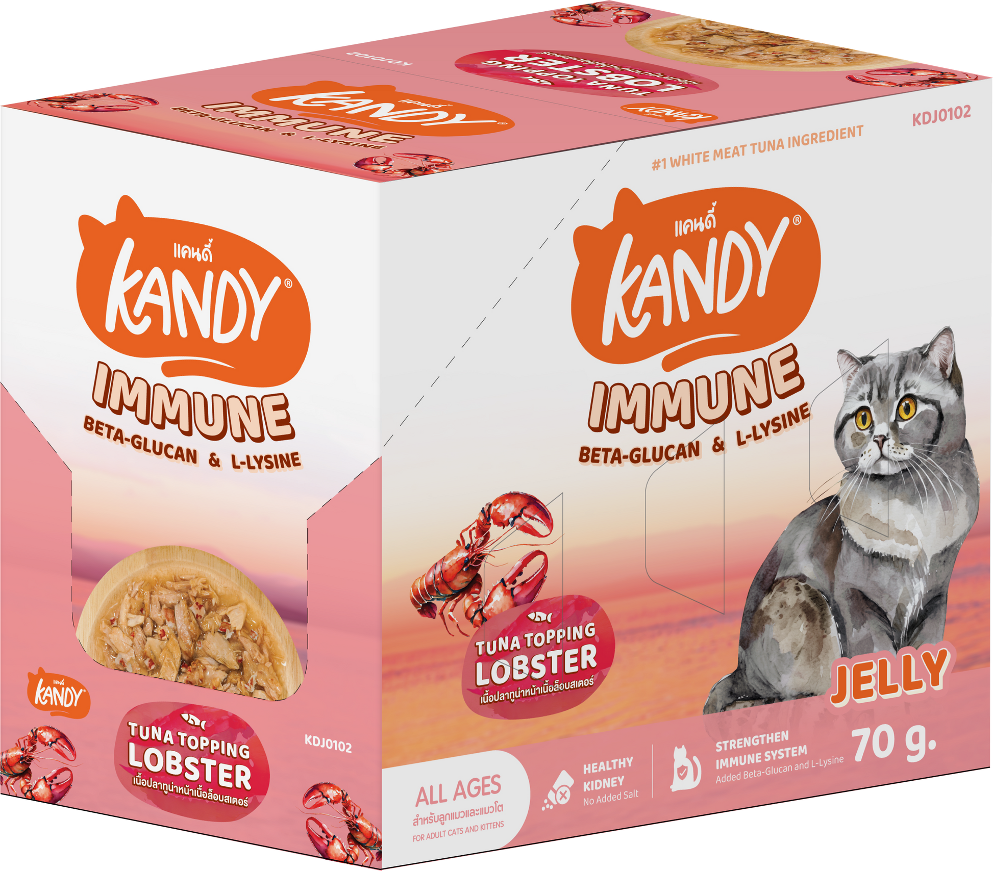 Kandy Immune Formula Cat Wet Food 70g is a premium-quality wet food made in Thailand, crafted with real tuna and lobster in jelly to provide superior taste and essential nutrition for cats.